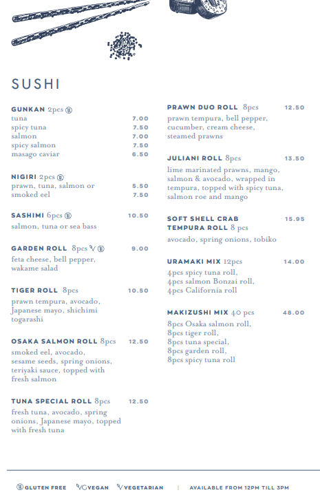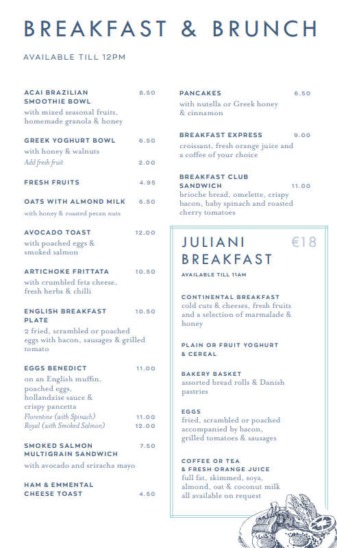 The menu at Café Juliani feels carefully balanced between comfort classics and contemporary flair, offering a clear snapshot of the kitchen’s versatility. Mornings are anchored by familiar favorites like Cappuccino, rich and well-rounded, paired naturally with hearty options such as Eggs, the English Breakfast Plate, and the more indulgent Juliani Breakfast, all of which emphasize generous portions and traditional flavors. Lighter starts are equally well represented through the Continental Breakfast and refined dishes like Smoked Salmon, which bring a cleaner, more elegant touch to the table. For guests seeking something vibrant and modern, the Acai Brazilian Smoothie Bowl stands out as a colorful, refreshing contrast that broadens the breakfast and brunch appeal. As the day progresses, the menu transitions confidently into more adventurous territory, highlighted by the bold flavors of Peking Duck with Pulm Sauce, a dish that signals ambition and depth, and the carefully constructed Tiger Sushi Roll, which adds an international, contemporary edge. Drinks are not treated as an afterthought, with the Aperol Spritz offering a crisp, social accent that complements both light bites and fuller meals. To finish, the classic Tiramisú provides a familiar yet satisfying conclusion, reinforcing the menu’s commitment to quality and balance. Taken as a whole, the menu reads as cohesive and well-curated, successfully combining approachable staples with standout signature dishes that leave a lasting impression of variety and thoughtful execution.